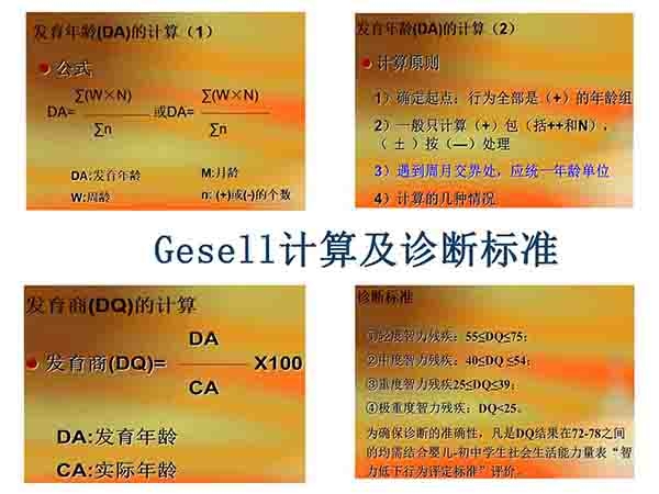 格賽爾(Gesell)智能診斷法適用于嬰幼兒。這種方法 從動(dòng)作能、應(yīng)物能、言語能及應(yīng)人能4個(gè)方面進(jìn)行檢查,并把4周、16周、28周、40周、52周、18個(gè)月、24個(gè)月、36個(gè)月作為8個(gè)“樞紐年齡”,即 在這些階段顯示出特殊飛躍進(jìn)展。所測得的結(jié)果,以發(fā)育商數(shù)(DQ)來表示。